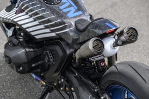 La bombola di protossido di azoto dal design aggressivo è posizionata tra i due silenziatori posteriori in titanio, iniettando il protossido di azoto nel sistema di iniezione al semplice tocco di un pulsante. Questo conferisce al pilota e alla moto una spinta aggiuntiva verso il traguardo.